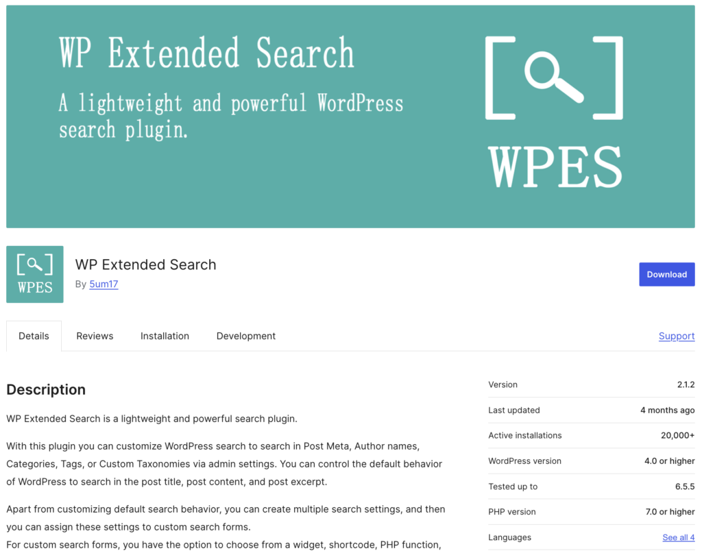 | WP Extended Search | Free | Open source, allows custom search & restrictions, unlimited search forms | 4.9/5 |